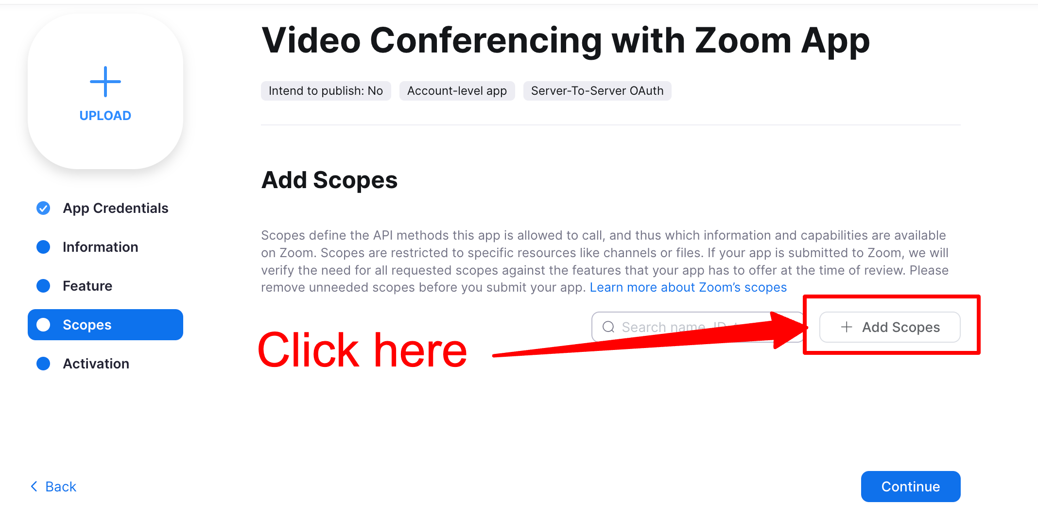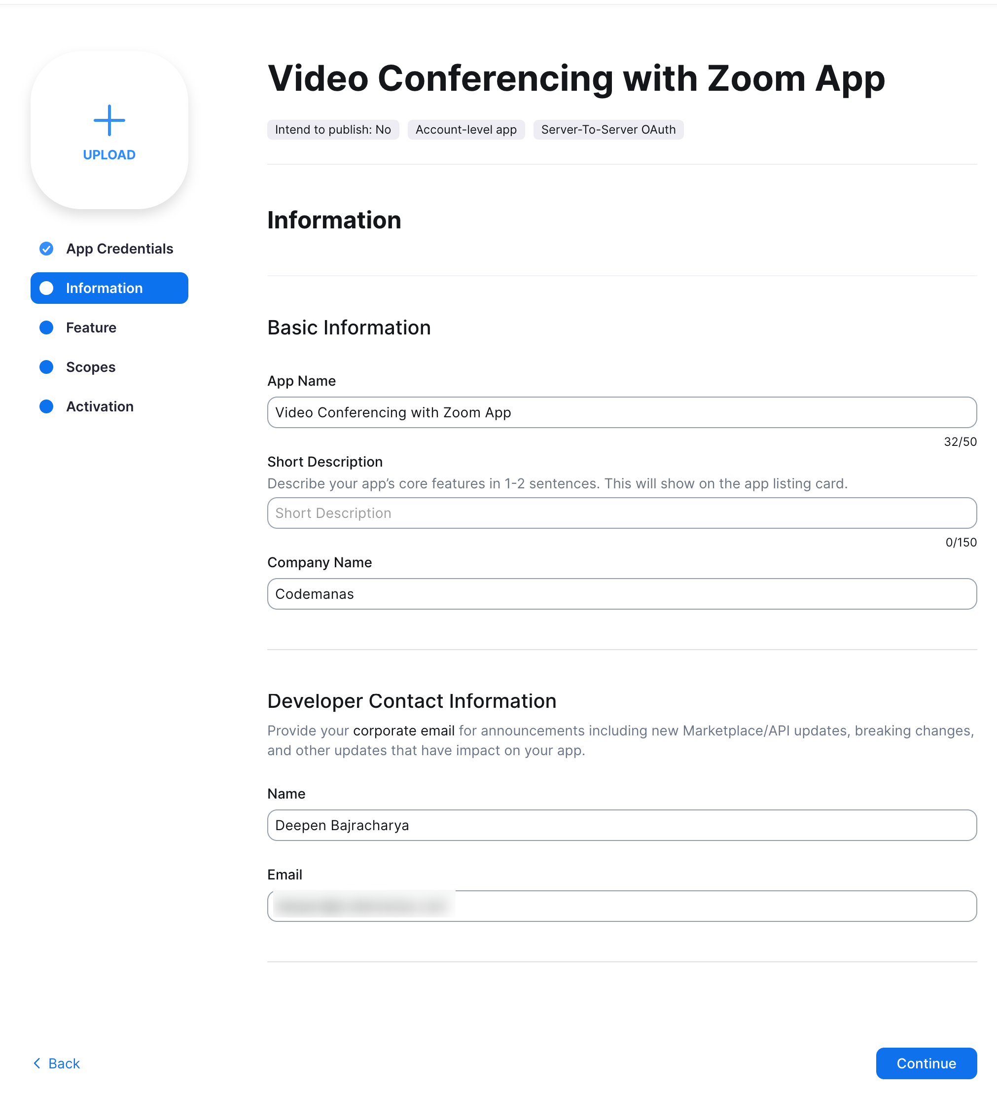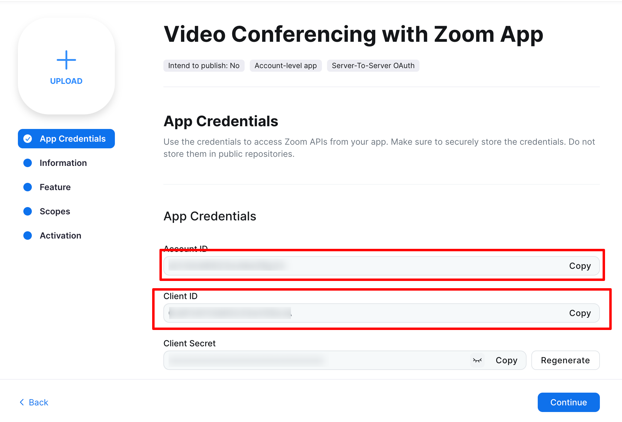 Once App is created - you will be taken to an App Overview page where you can see App Credentials. These highlighted credentials will be used in our WordPress Video conferencing Zoom plugin to connect with your account. We'll get back to this in next steps. Click Continue for now.