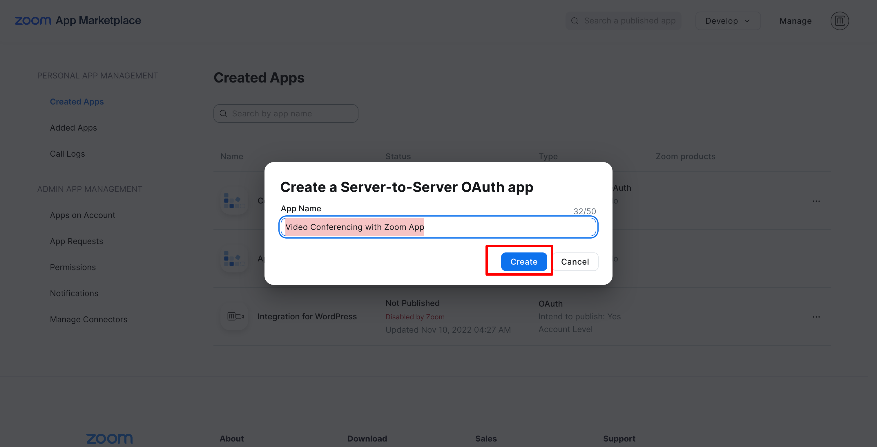 Click on Server to Server OAuth App and click create.