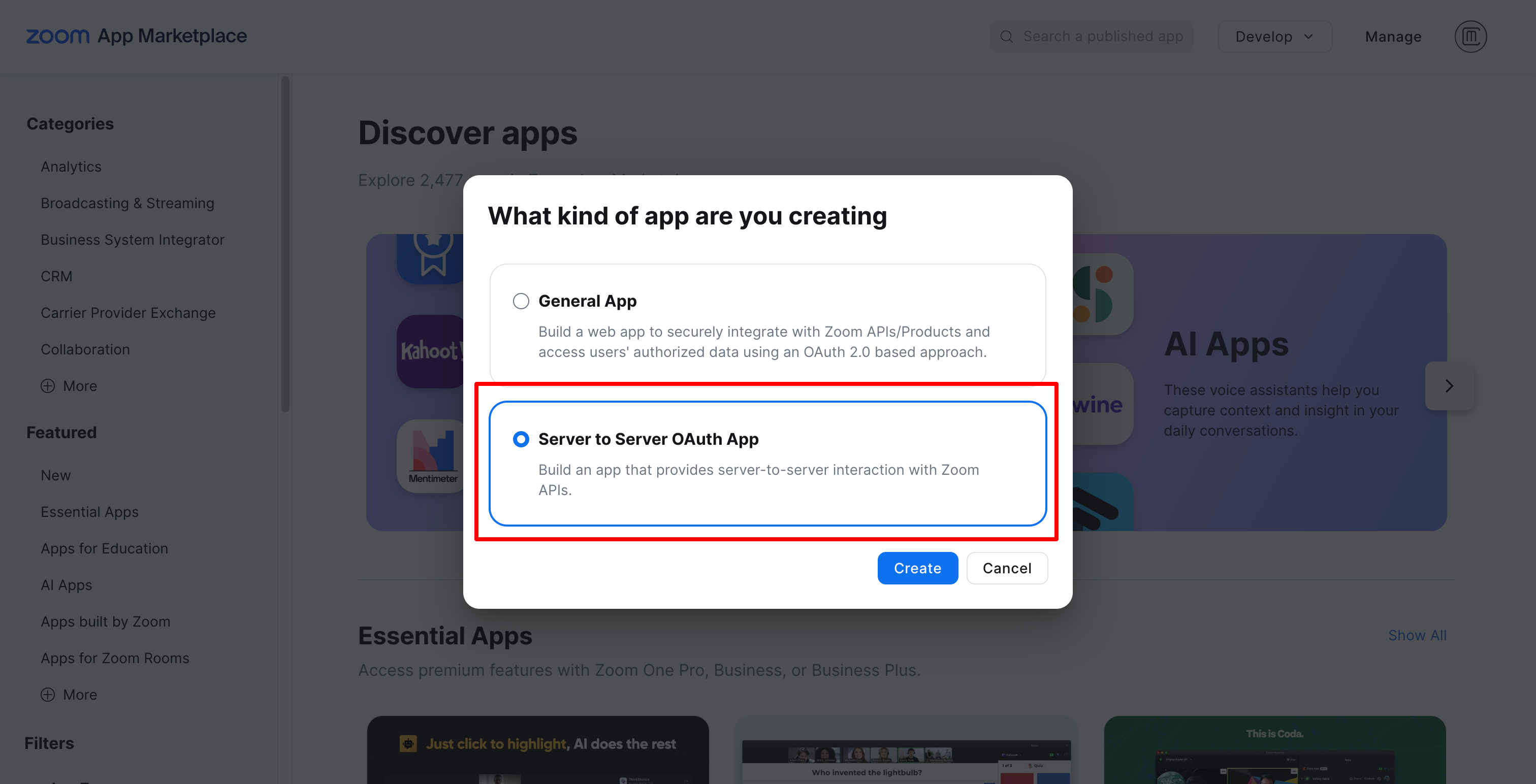 OR you can simply click this https://marketplace.zoom.us/develop/create and this will open a modal like in below screenshot.