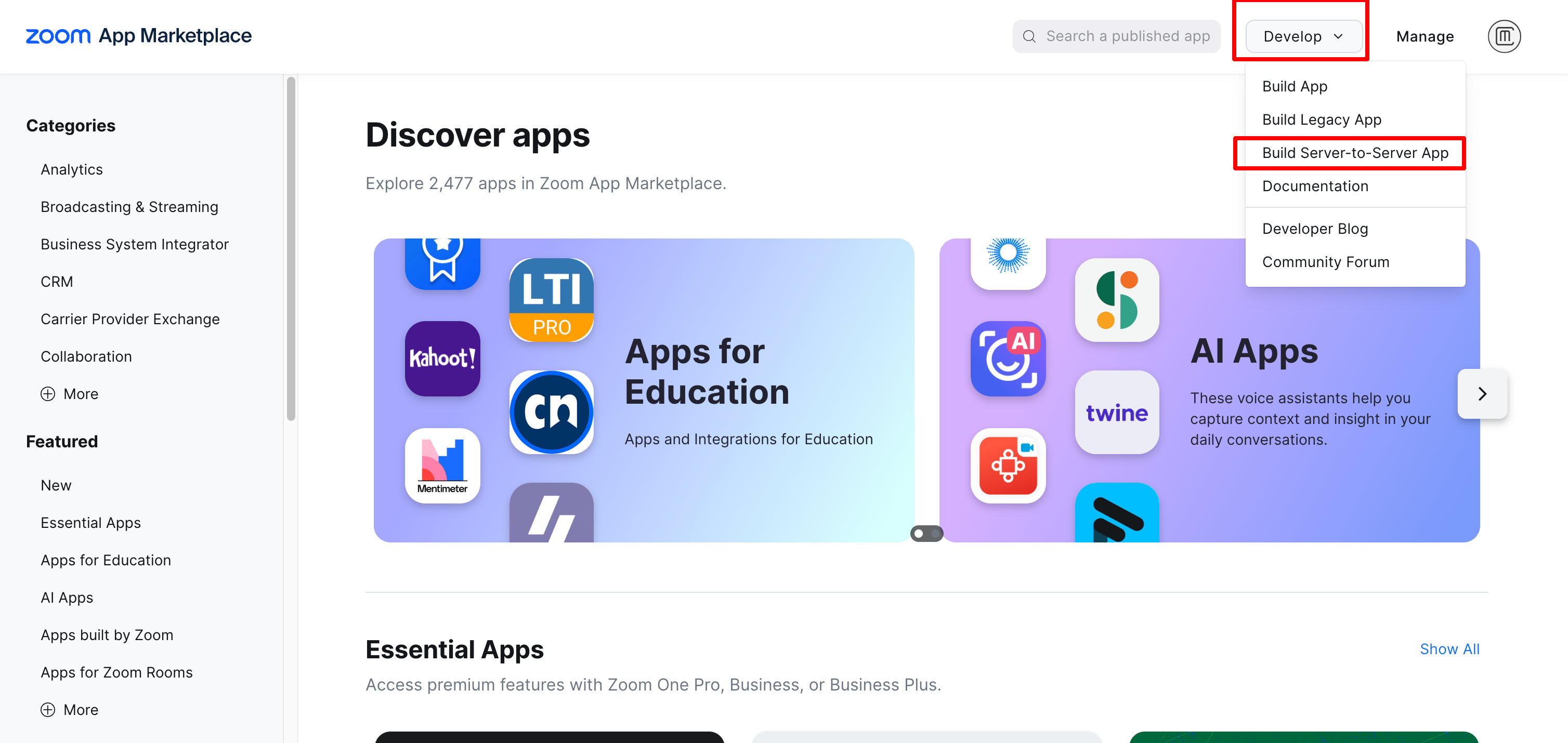 Creating Server to Server App type- Goto Zoom Marketplace page from https://marketplace.zoom.us/