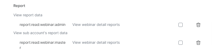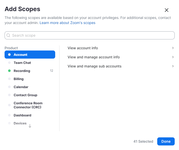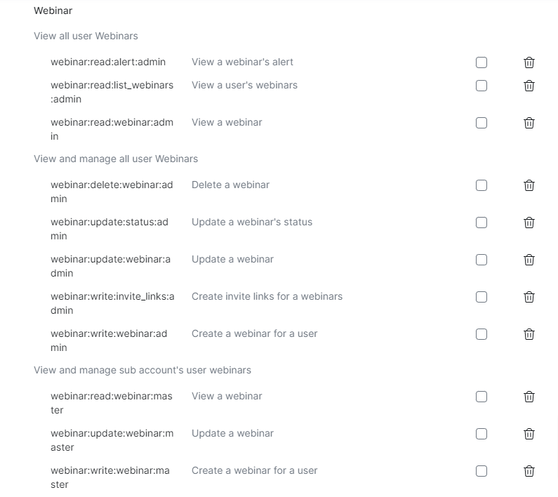 Note: Not adding any of the below permissions may result in permission issue error notices when trying to create your meeting/webinars.