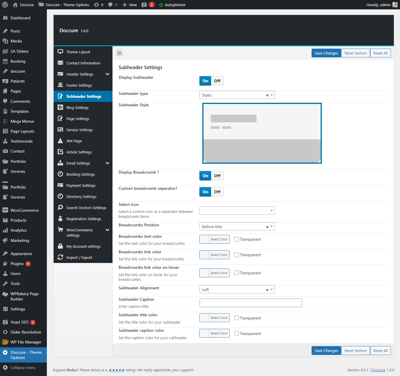 Subheader settings contain the Subheader and the breadcrumb, you can enable/disable them, you can also set the background, colors, alignment, style and so on.